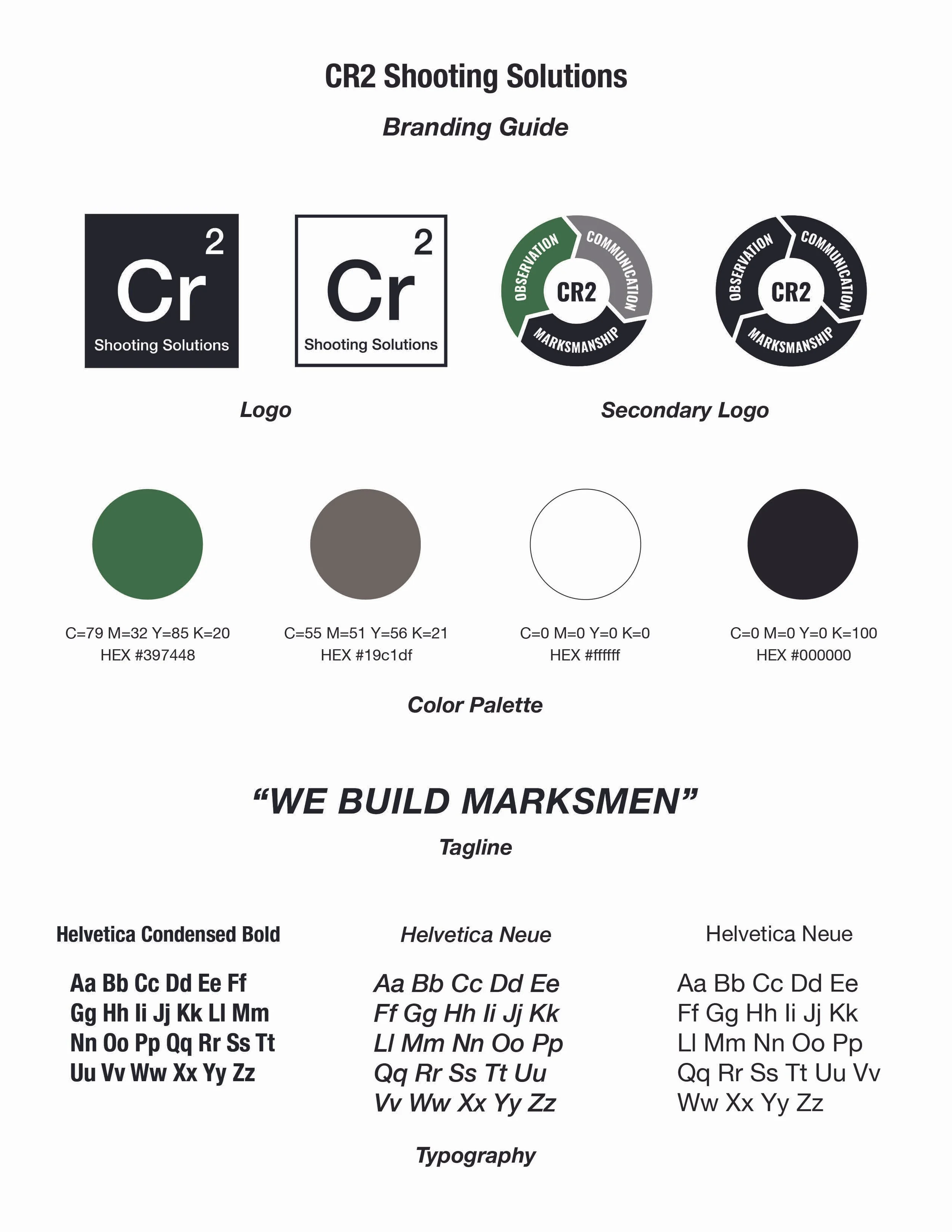 The color palette of green, gray, and black supports CR2’s identity by communicating focus, professionalism, and strength. Green suggests readiness and clarity. Gray adds balance and neutrality. Black brings boldness and authority. Together, these colors form a visual system that speaks to the brand’s discipline and versatility.
