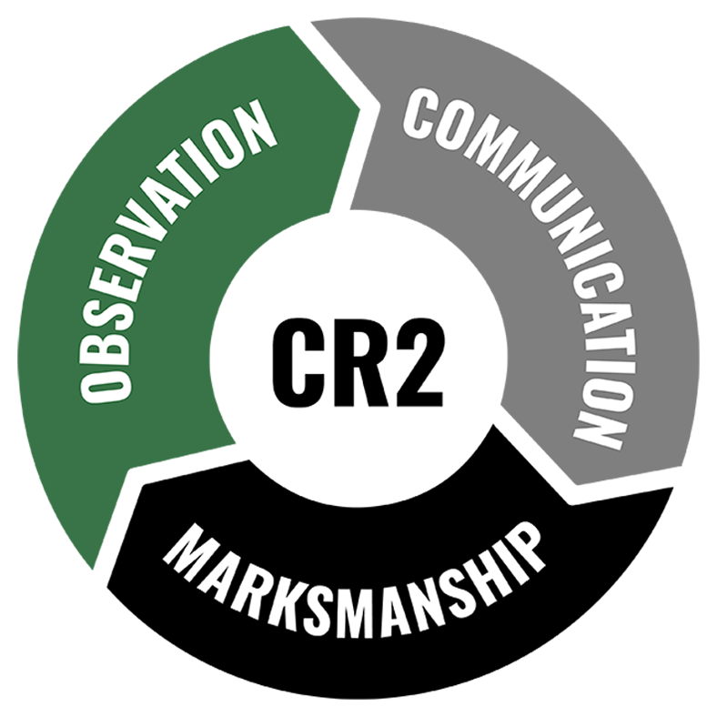 Multiple logo variations were developed to support use across printed, digital, and apparel. A secondary logo was created to represent the CR2 Pillars: Observation, Communication, and Marksmanship, which form the foundation of CR2’s curriculum for military personnel, law enforcement professionals, competitors, and outdoor enthusiasts.
